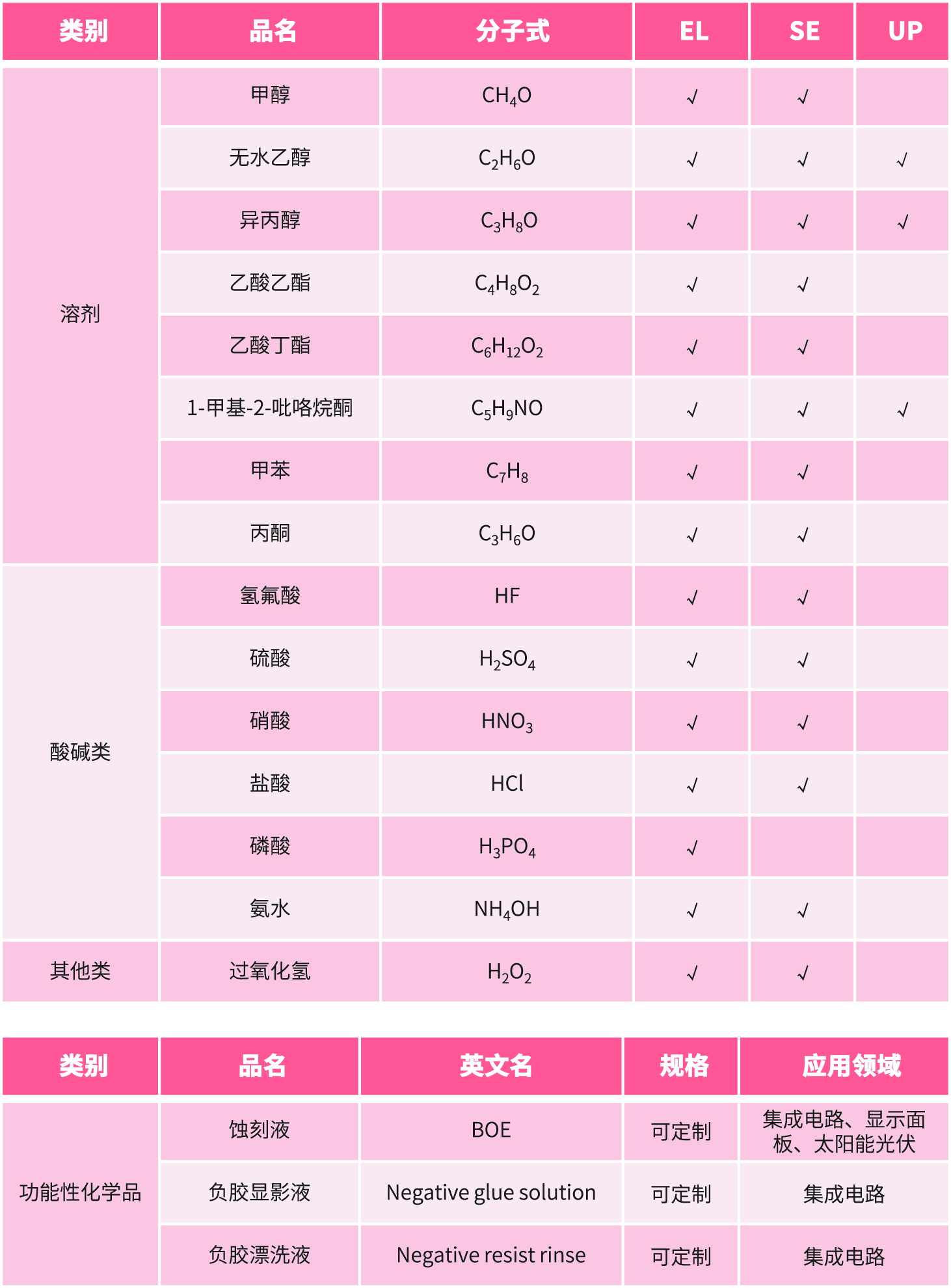 除了電子級磷酸之外,我司還提供電子級的無水乙醇、鹽酸、硝酸等,此類產(chǎn)品可用于集成電路、太陽能光伏、顯示面板領(lǐng)域的清洗、刻蝕等環(huán)節(jié),并且已經(jīng)成功服務(wù)了眾多行業(yè)內(nèi)的客戶。